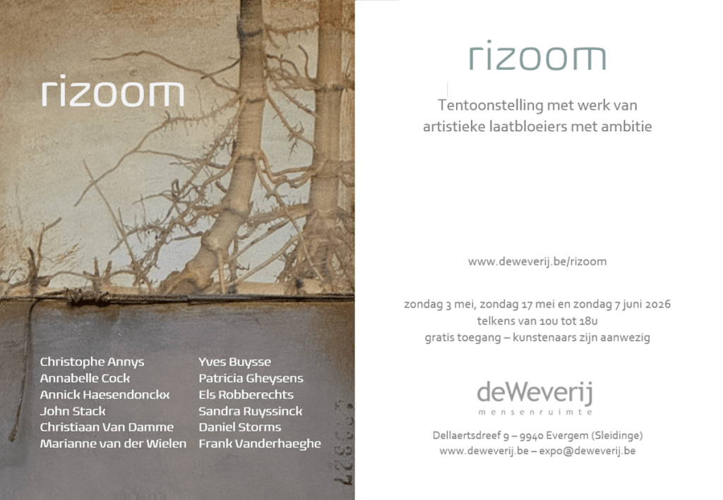 Rizoom is een project van deWeverij voor kunstenaars tussen 50 en 67 jaar die nog beroepshalve actief zijn of een overstap naar de kunst overwegen, en tegelijkertijd uitermate gedreven zijn om als kunstenaar alsnog het verschil te maken. Het omvat een groepsexpositie met gelijkgestemden, maar ook een lerend netwerk traject waarbij er gewerkt wordt aan het kunstenaarschap door uitwisseling met andere kunstenaars en inbreng van externe expertise.