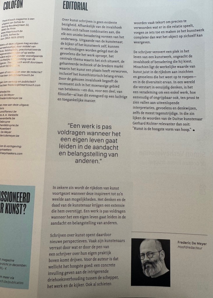 ‘Kunst is de hoogste vorm van hoop’ van de Duitse kunstenaar Gerhard Richter wordt geciteerd in het lezenswaardige editoriaal van Frederic De Meyer in de eerste The Art Couch van 2025.