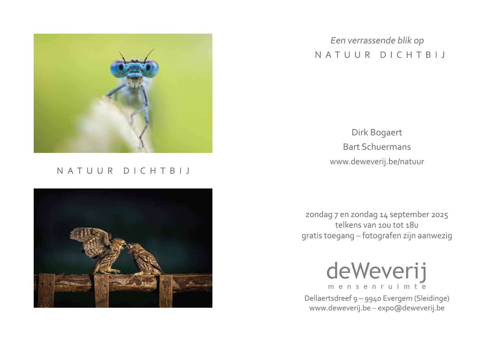 Een verrassende blik op natuur dichtbij door fotografen Dirk Bogaert en Bart Schuermans. De fototentoonstelling was te bezoeken op zondag 7 en zondag 14 september 2025 in het bijzijn van de fotografen. Op 10 september was er een druk bijgewoonde informatieve rondleiding waar de twee fotografen dieper ingingen op het ontstaan van de beelden van de tentoonstelling. Ruim 500 bezoekers bezochten de tentoonstelling!