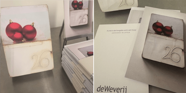 Onder het motto van Gerhard Richter ‘Kunst is de hoogste vorm van hoop’, is er nu tijdelijk een originele kerst-nieuwjaarskaart, in de stijl van de werken uit de Expeditie-reeks. Een pakketje van 10 kaarten met bijhorende enveloppes kost 15 euro (inclusief verzendingskosten). Bij interesse, stuur een e-mail naar marc@deweverij.be of vul onderstaand formulier in met vermelding ‘Kaarten’.